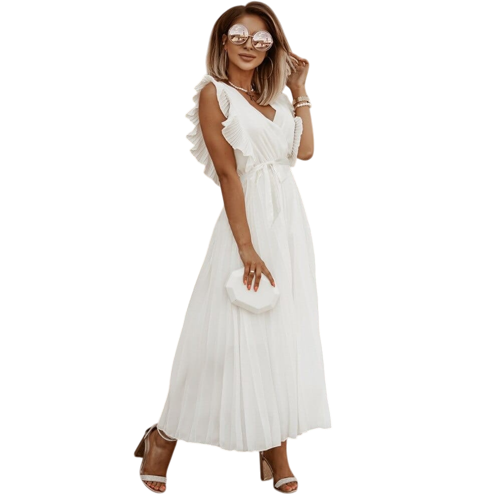 Sybil - Elegant Women's Maxi Ruffle Dress With Belt is a flowing maxi dress designed to make you feel effortlessly feminine and confident. Soft pleats, delicate ruffle sleeves and a cinching belt create a flattering silhouette that moves beautifully from day to night.
